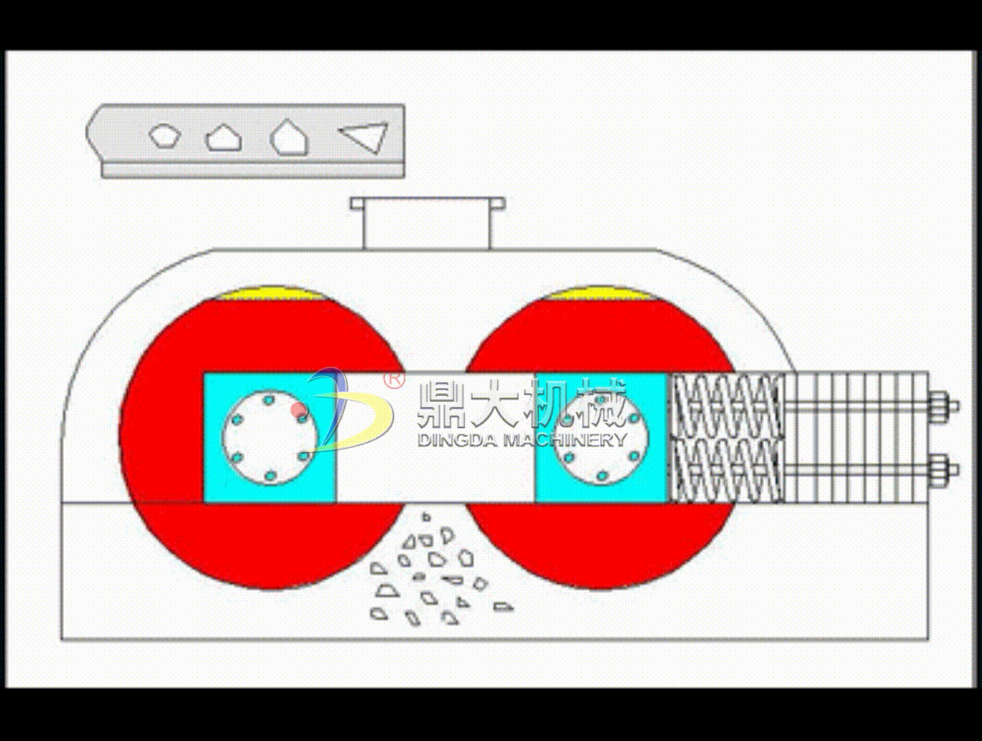 ? ? ? ? 2、出料粒度的調(diào)節(jié):兩輥輪之間裝有楔形或墊片調(diào)節(jié)裝置,楔形裝置的裝有調(diào)整螺栓,當(dāng)調(diào)整螺栓將楔塊向上拉起時,楔塊將活動輥輪頂離固定輪,即兩輥輪間隙變大,出料粒度變大,當(dāng)楔塊向下時,活動輥輪在壓緊彈簧的作用下兩輪間隙變小,出料粒度變小。墊片裝置是通過增減墊片的數(shù)量或厚薄來調(diào)節(jié)出料粒度大小的,當(dāng)增加墊片時兩輥輪間隙變大,當(dāng)減少墊片時兩輥輪間隙變小,出料粒度變小。